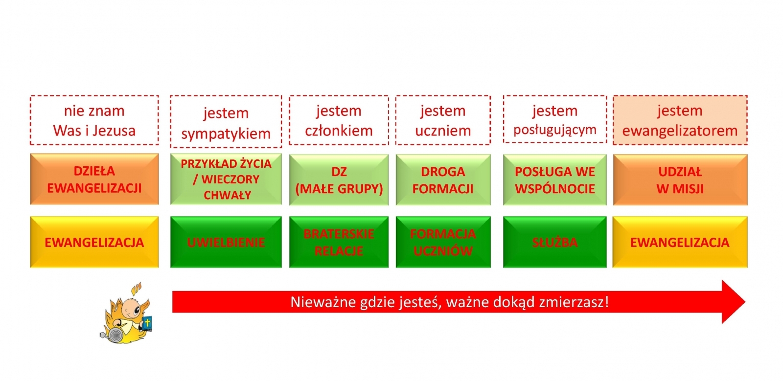 Droga we Wspólnocie prowadzi każdego z nas poprzez wypełnianie 5 biblijnych celów - od osoby, która jest ewangelizowana, do osoby, która staje się uczniem i przyjacielem Jezusa oraz radosnym ewangelizatorem.